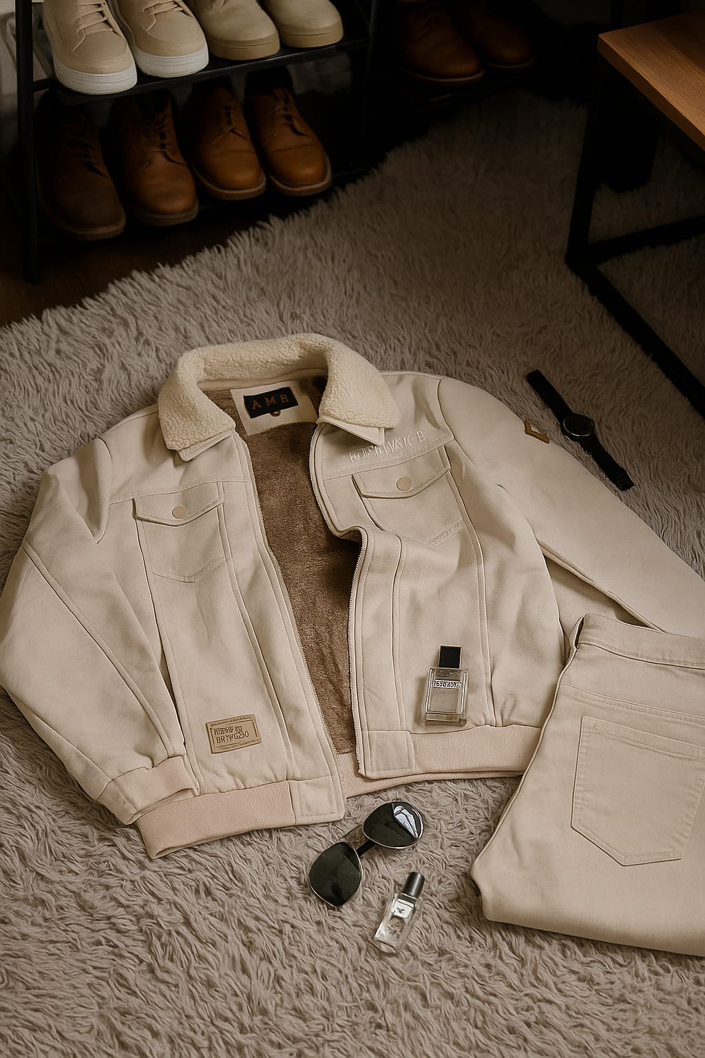Men's Beige Winter Jacket with Faux Shearling Lining